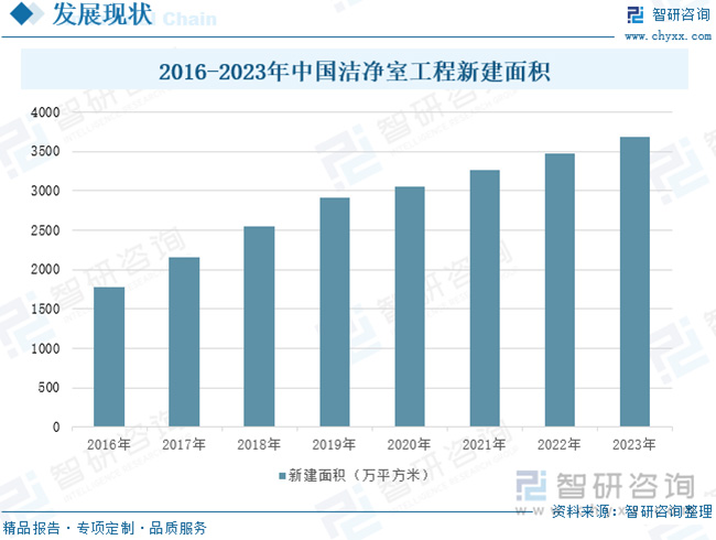 目前,全球半導(dǎo)體、光電等電子信息產(chǎn)業(yè)在世界范圍內(nèi)轉(zhuǎn)移,東亞、東南亞等地區(qū)已成為世界電子信息行業(yè)的主要市場和發(fā)展重心;同時(shí)由于我國醫(yī)藥衛(wèi)生、半導(dǎo)體、航空航天等事業(yè)的不斷發(fā)展,加速推動(dòng)了潔凈室的市場化需求,從而帶動(dòng)我國潔凈室工程產(chǎn)業(yè)的快速發(fā)展。2023年,中國潔凈室工程新建面積達(dá)3689萬平方米,同比增長6.04%。